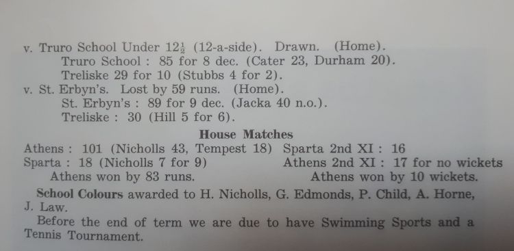 Cricket however was more suited to those of a more diminutive stature and was played in warmer and drier conditions. I’d played family games of cricket and French cricket so bowling and catching a ball were already developing skills which could be used in the more organised form of the game. I can’t recollect many details of the matches apart from coming on to bowl in a house match with the score on 93, which would then become my lucky number as a result and getting a couple of wickets. As with other activities at the school cricket was played in a character forming format where you played to win not to give everyone a game and you might only be closely involved for one ball of the match. I watch our Under 11s and younger age groups at our club today and am envious of all the fun they now have and also don’t have a hard leather ball making it’s mark on soft young hands and other delicate parts of the human anatomy. Everyone gets an equal go at batting and bowling and its seems a lot more fun than the games I took part in at that age. Cricket at school was largely dominated by fear of that ball hitting you as there seemed to be a lot of fast bowlers around terrorising their opponents. One of those quick bowlers at the time was a certain Howard Treweek Nicholls a feared opponent from Athens house at the time and now a good friend having toured together and been fellow imbibers at the William IV in Truro a few years later. He tended to dominate games in those days as the caption below shows. My successes as a bowler were in the game where we dismissed Athens for 101 but were then skittled by Howard. I can’t recall my innings that day must it must have been a very brief affair.