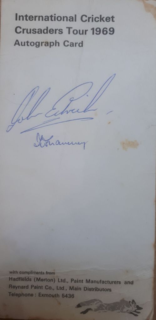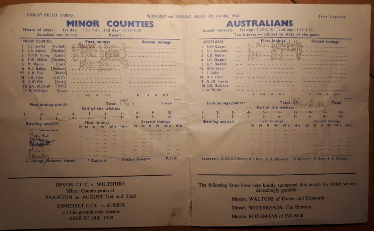 We also went further afield to see The Minor Counties v The Australians at Torquay in 1968 a two-day game which ended in a draw. The Australians, captained by Bill Lawry, included Ian Chappell, Neil Hawke, Doug Walters, Graham McKenzie, Ashley Mallett, Paul Sheahan and Bob Cowper.