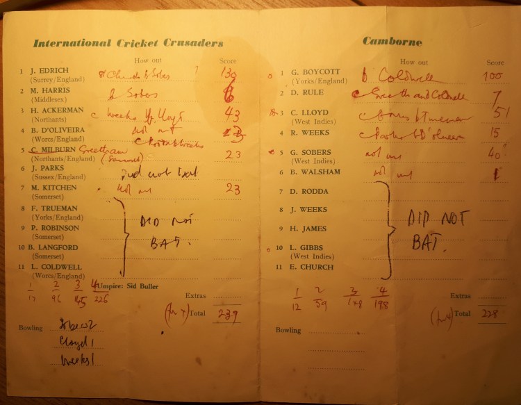 In my schooldays went to many games of cricket with my father who was a good cricketer and all round sportsman and was lucky enough to see some of the great players of the time. The international cavaliers used to tour Cornwall in September and play the local clubs who were loaned a few players for the games to even things up a bit such as G. St A Sobers, C. Lloyd and G. Boycott. In the game illustrated on 21st September 1968 my maths school master ‘Joe’ Church stumps John Edrich off Garfield Sobers probably his most illustrious dismissal if not his most difficult as the England opener walked off to give others a bat.