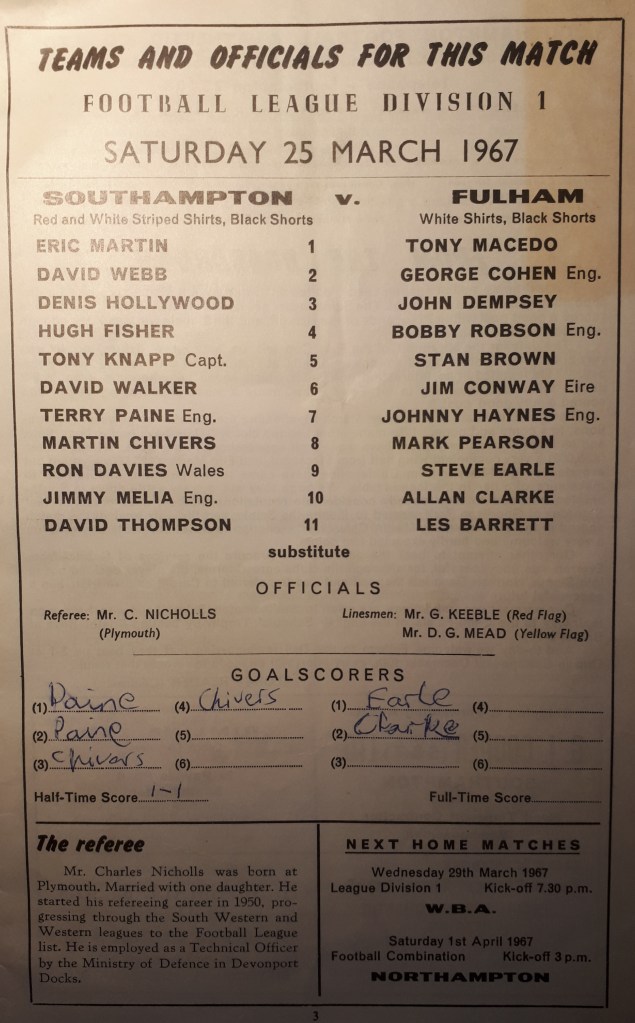 We also went to The Dell in Southampton once in 1967 to see the home club play Fulham where the visitors included the great Johnny Haynes at the end of his distinguished career. Chivers and Paine both scored 2 for Southampton in a 4-2 victory but enough about that game which John Arlott once described as breaking out during the cricket season.