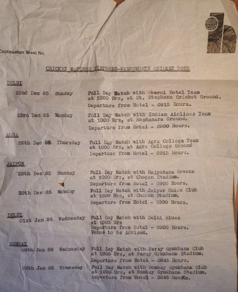 This touring team from England was quite different from the vast majority that had toured that sub continent previously as we were not professional cricketers but a group of amateur cricketers of varying ability brought together playing for a team that originated as the Dwileflonkers* CC. That wandering team was originally conceived in a pub in Kent and and after formation pootled around the leafier bits of London playing anyone that would have them. Wandsworth Occasionals, as they later became, joined the Club Cricket Conference, that great South East organisation, where clubs could get fixtures when they had any blank dates in their diary. In order to get home fixtures Wandsworth Occasionals moved to a pitch on Barnes Common which they described as the one of the prettiest pitches in London, if not the best playing surface. They are now known as Barnes Common CC more in keeping with their location.